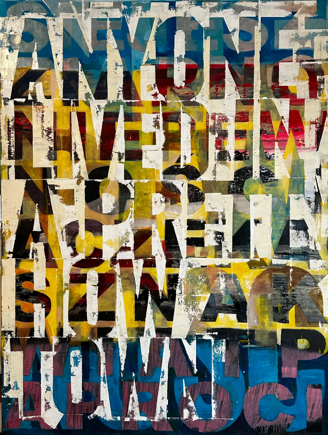 Zaraz potem pojawia się tłum. Bezimienny. Gęsty. Dwie duże prace w rogu nie odpowiadają, lecz dociskają. Jednostka, ledwie przed chwilą wywołana na scenę, zostaje natychmiast wchłonięta przez masę. Obecność innych nie przynosi ulgi – przeciwnie, potęguje samotność. Typograficzna fraza o ziemi i słońcu działa tu jak kosmiczne przypomnienie: każdy z nas tkwi osobno, nawet jeśli stoimy ramię w ramię. Intensywność malarstwa nie opisuje świata – ona go przeżywa. Druga sala zmienia rejestr. Pojawia się struktura.